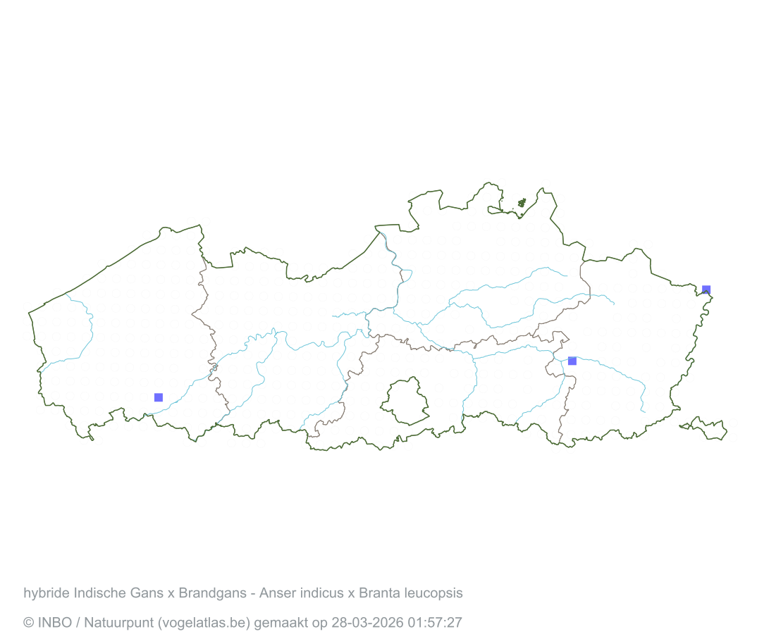 hybride Indische Gans x Brandgans Latijnse naam Anser indicus x Branta leucopsis Engelse naam Barnacle Goose x Bar-headed Goose Alle kaarten
