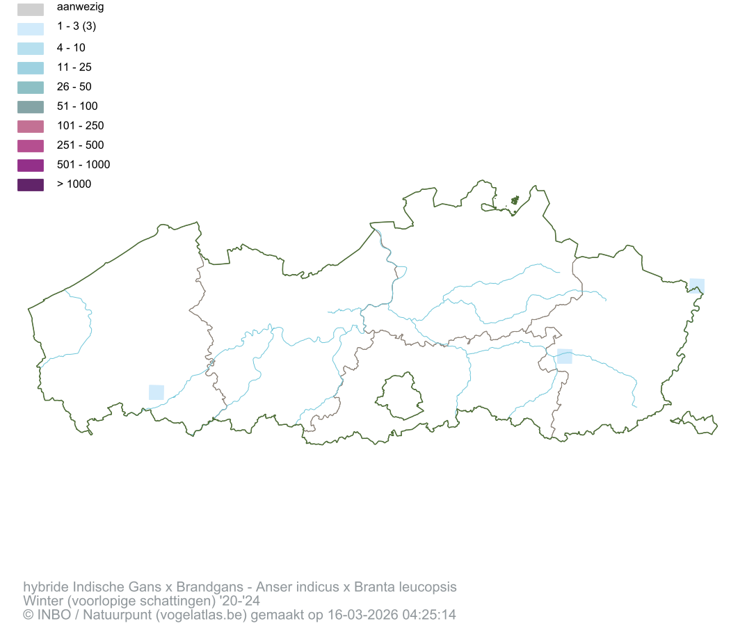 hybride Indische Gans x Brandgans Latijnse naam Anser indicus x Branta leucopsis Engelse naam Barnacle Goose x Bar-headed Goose Alle kaarten